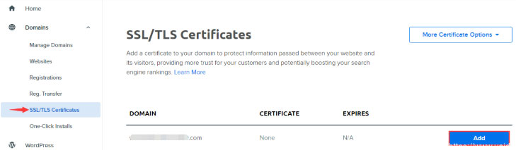 在右侧的SSL证书操作页面,找到我们要添加SSL证书的域名,点击Add按钮开始添加。