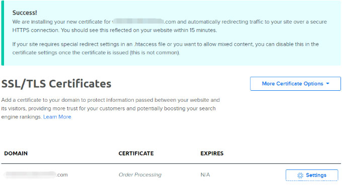 以上就是使用DreamHost主机给网站添加SSL证书的过程。点击域名证书后的Settings可以对添加的SSL证书进行相关管理,可以查看SSL证书的具体信息,页可以对SSL证书进行删除等操作。