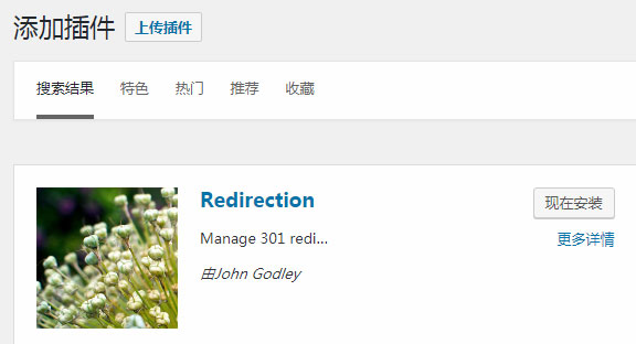 第一步,首先我们需要安装插件,在WordPress网站后台搜索301,然后我们就可以看到最受欢迎的插件叫做Redirection,安装量超过100万,安装并激活该插件。