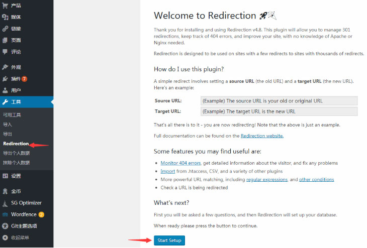 第二步,我们在工具菜单中找到Redirection,然后我们就来到了插件的设置,点击最下面的Start Setup开始。