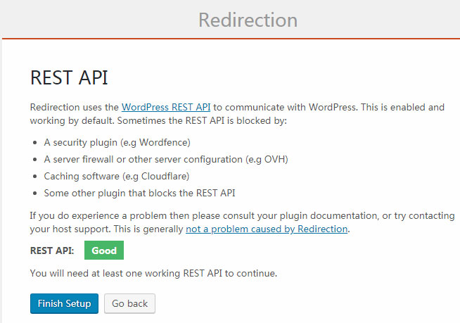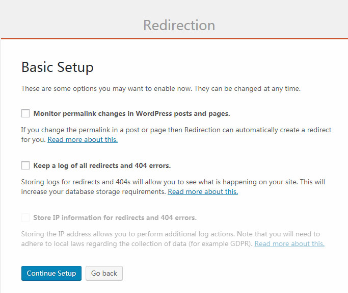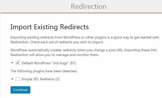 第三步,完成插件设置以后,我们就开始使用Redirection插件了。Import Existing Redirects指的是导入已经存在的跳转,包括WordPress默认的旧的slugs,以及其他插件中的跳转,选择以后点击Continent继续。