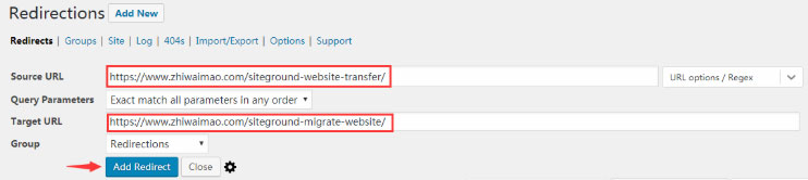 点击Add New以后我们就可以添加一个新的跳转,在Source URL中输入我们之前旧的网址,然后在Target URL中输入我们想要跳转到的最新网址,最后点击下面的Add Redirect完成添加。