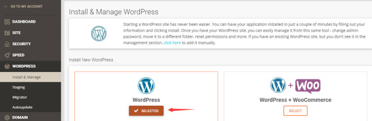 第二步,选择左侧菜单栏中的WordPress,然后选择子菜单中的Install & Manage,WordPress网站安装有两种版本,一是直接安装WordPress网站,二是安装WordPress+WooCommerce,大家根据自己的需要进行选择。选择以后,点击SELECTED进入下一步。