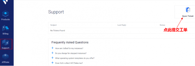 首先进入Vultr后台管理面板,然后在左侧菜单栏选择“Support”选项,然后点击“Open Ticket”图标,如下图所示: