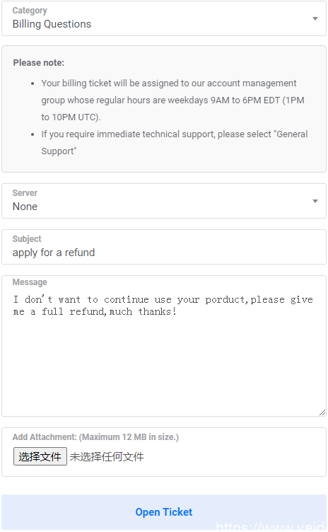 进入账单填写页面,选择“Billing”部门,然后主题就写退款,类似“apply for a refund”都可以,工单内容就说想申请全额退款,类似这样的话语“I don’t want to continue use your porduct,please give me a full refund,much thanks!”