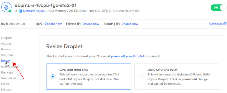 磁盘,CPU和RAM;此选项增加或减少Droplet方案可用的CPU和RAM数量,并永久增加Droplet方案的磁盘空间大小。
