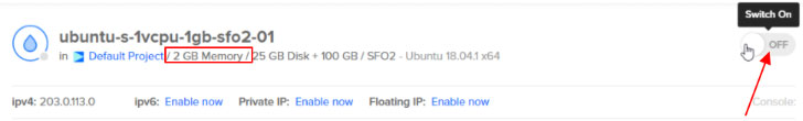 5、调整资源配置完成后,单击“On/Off”按钮以重新启动Droplet方案。(从下图可以看到RAM已经从1GB增加到2GB)