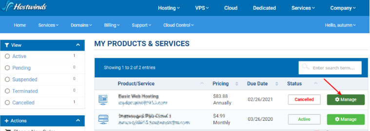 首先登录Hostwinds官网后台,选择Services -> My Services菜单,然后点击想要退款方案后面的“Manage”按钮,如下图所示: