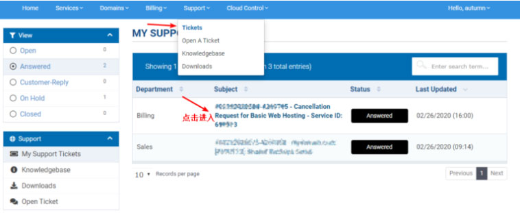 访问Hostwinds官网,点击页面右上角“Open A Ticket” 菜单,然选择Support-》My Support Tickets,这样就可以刚刚申请退款Ticket,如下图所示: