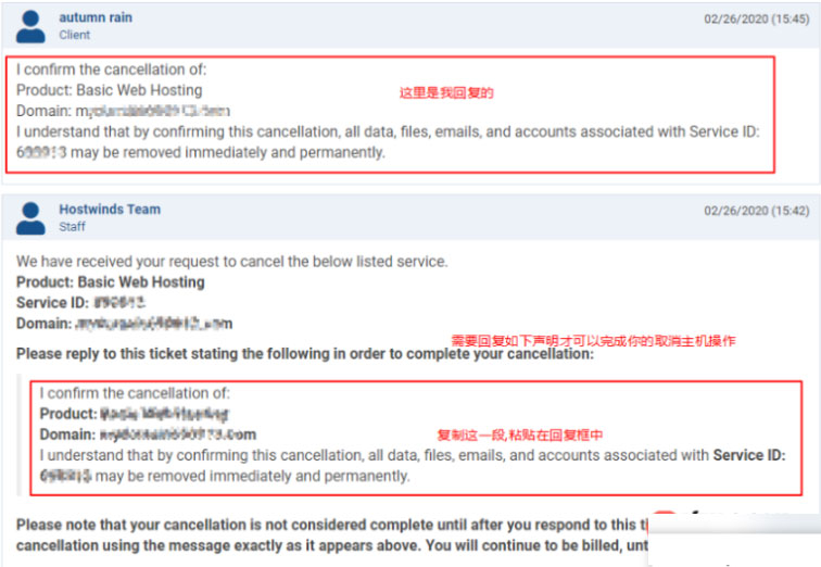 回复之后,还会再次收到邮件通知,主要就是告诉你主机已经正式被取消了。