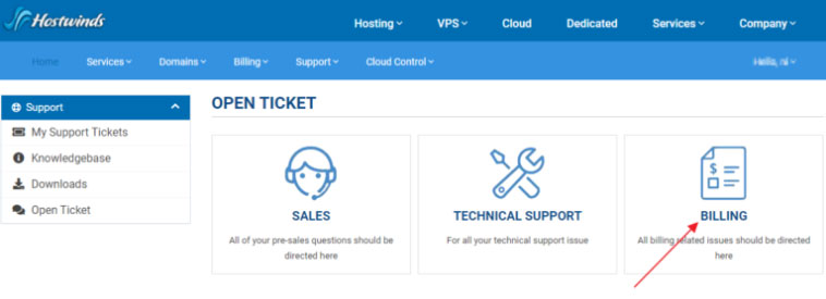 主机取消了之后就可以申请退款了,仍然是访问Hostwinds官网,点击页面右上角“Open A Ticket” 菜单,然后点击“BILLING”选项,