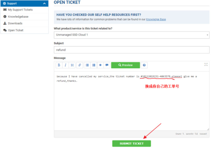 选择之后回复想要退款,內容可以参考”because I have cancelled my service,the ticket number is 这里写你取消主机的Ticket工单号,pleasel give me a refund,thanks.
