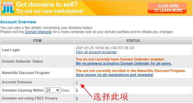 首先,进入NameSilo后台管理,然后点击域名账户选项,具体如下图所示: