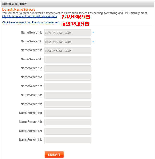 接下来会接入NS域名服务器管理页面,一般情况下填写的是NameSilo默认NS服务器(即DNSOWL.COM),也可以使用NameSilo高级NS服务器(即PREMIUM-NS1.DNSOWL.COM):