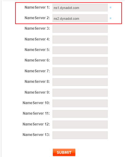 上面默认的NS服务器都是NameSilo自己的,如果不想使用,而是想换成其它的,例如cloudflare、GoDaddy、Dynadot等NS服务器,那么可以直接替换即可。如果两个NS不够填写的话,可以继续增加输入框,最多可以填写13个NS。填写后,点击底下的“SUBMIT”按钮。