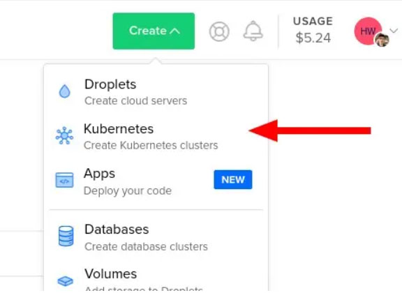 首先登录DigitalOcean帐户,点击屏幕右上方的绿色“创建”按钮。从出现的菜单中选择“ Kubernetes”选项,如下图所示: