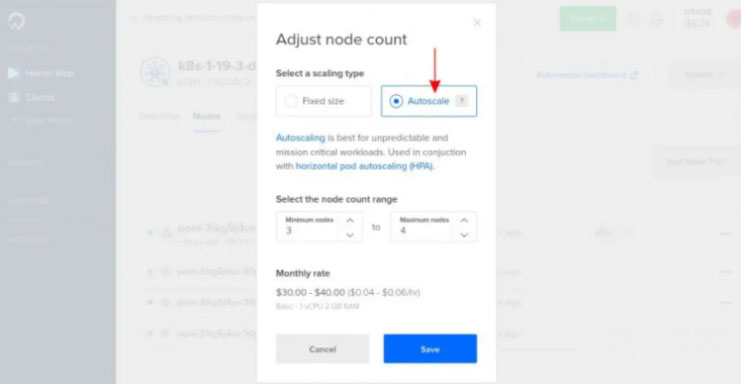 选择“自动缩放”单选按钮以定义节点数量的最小到最大范围,这样将根据群集工作负载的资源使用情况自动添加和删除其他节点。