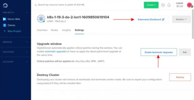 DigitalOcean还提供自动群集升级。点击屏幕顶部的“设置”标签。接下来,按“启用自动升级”。单击“编辑”按钮以自定义可接受的更新时间范围。