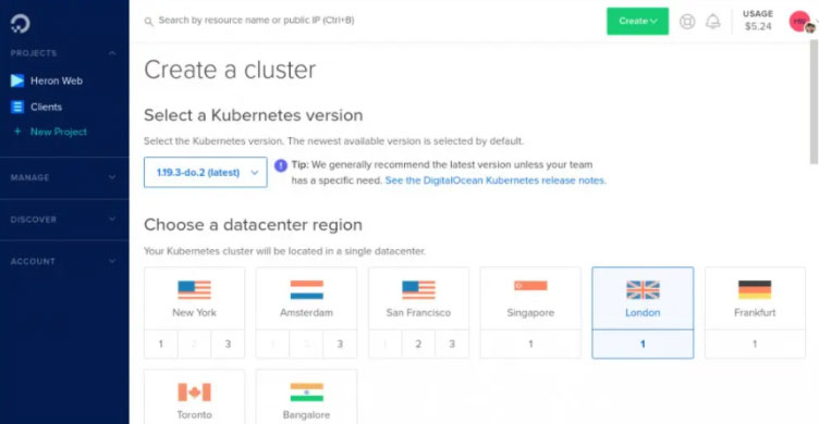 接下来,选择一个DigitalOcean数据中心以包含群集的资源,建议选择在地理位置比较靠近网站访客的机房,这样访问速度相对会快一些。