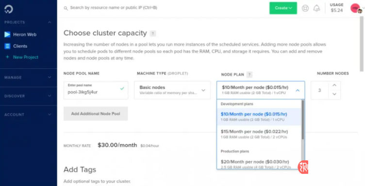 从“Node Plan”下拉列表中选择要使用的液滴类型。为了节省成本,这里使用了最小的选项– 1个vCPU和1GB RAM,每个节点每月10美元。DigitalOcean将此标记为“development plan”,因为可用资源不太可能用于长期生产。
