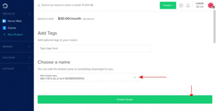 添加完节点后,向下滚动页面并为集群命名。单击“创建集群”按钮开始配置过程。这最多需要五分钟才能完成。