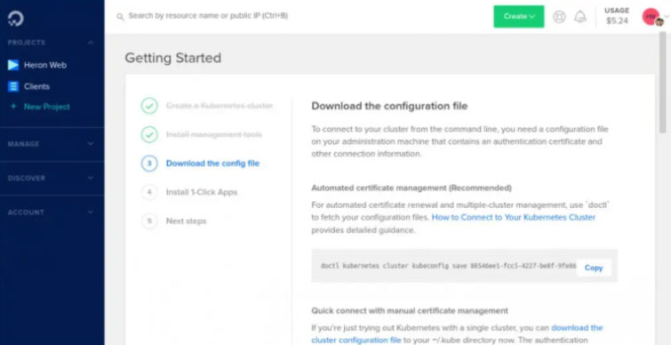 使用此方法时,请注意认证证书将在一周后过期。到期后需要重新下载它。另一种方法是doctl获取配置文件并配置自动证书管理–使用“自动证书管理”下显示的命令进行设置。