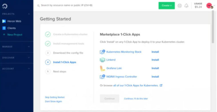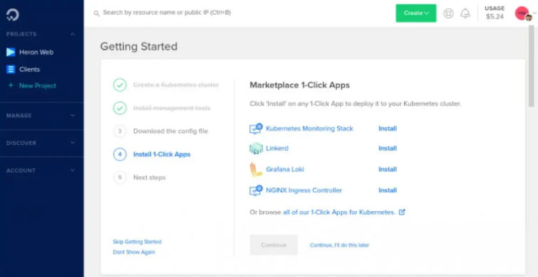 最后一个阶段使可以从DigitalOcean Marketplace快速安装“一键式应用程序”。这些是常用服务(例如NGINX Ingress Controller和Linkerd)的预配置部署。单击任何应用程序旁边的“安装”以添加到您的集群。该过程可能需要几分钟才能完成。