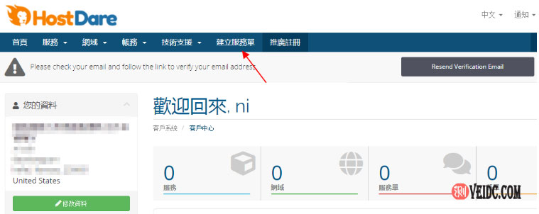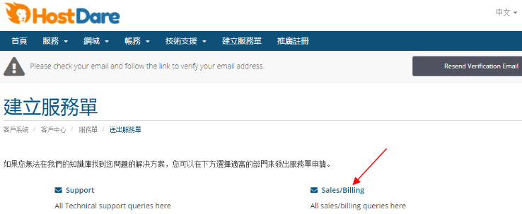1、首先使用账号登陆HostDare官网,在管理后台中点击“建立服務單”选项(可以将语言切换成中文),如下图所示: