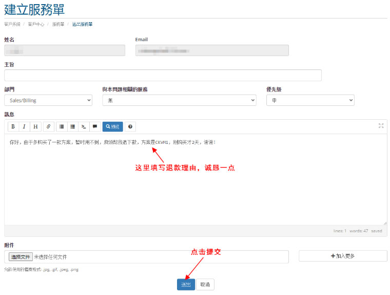 如果符合HostDare退款要求的话,那么只需提交Ticket进行申请即可,详细的退款流程如下。