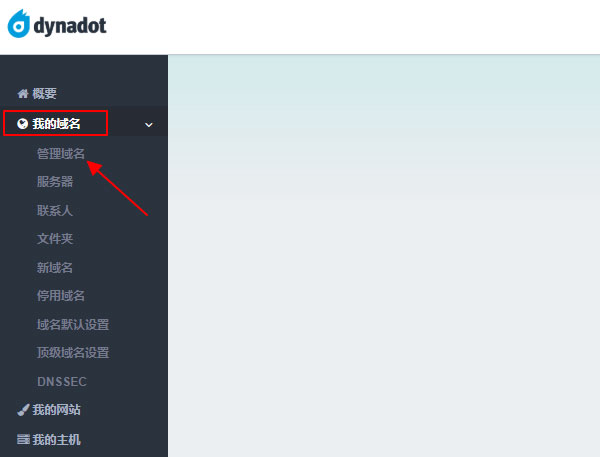 首先用账号登录Dynadot官网后台(建议切换成中文界面),进入管理面板之后(没有进入后台可以点击页面左上角“我的账号”菜单),在右侧菜单栏中找到“我的域名”——“管理域名”选项菜单,如下图所示: