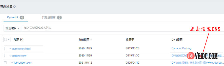 点击“管理域名”菜单选项之后就可以进入到域名管理页面,这里列出你当前所持有的全部域名,然后点击需要解析域名后面的DNS设置选项,具体参看下图所示: