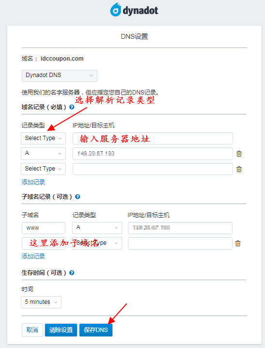 域名解析设置好之后点击“保存DNS”按钮即可,这样所有的设置在你设定的时间内就可以生效。