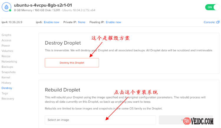 由于DigitalOcean云服务器扩展性强,而且按小时计费,所以除了可以自己重装操作系统之外,还可以摧毁当前方案,然后重新进行购买。但是,在不是迫不得已的情况,建议重装系统而不是摧毁重新购买,理由有两个。