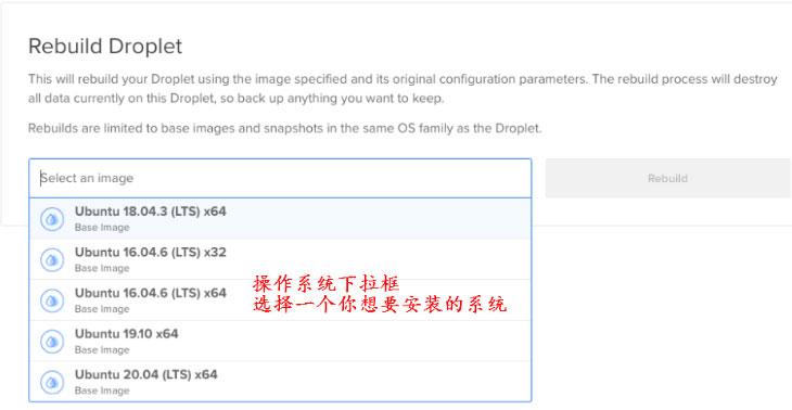 在上图重建页面中,单击“Select an image”文本框并搜索要使用的操作系统,如下图所示: