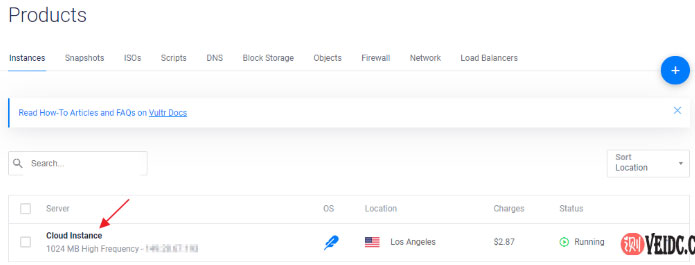 1、首先登陆Vultr后台管理中心,点击左侧“Products”菜单栏进入产品列表,然后再点击想要远程登录的云服务器VPS方案,如下图所示: